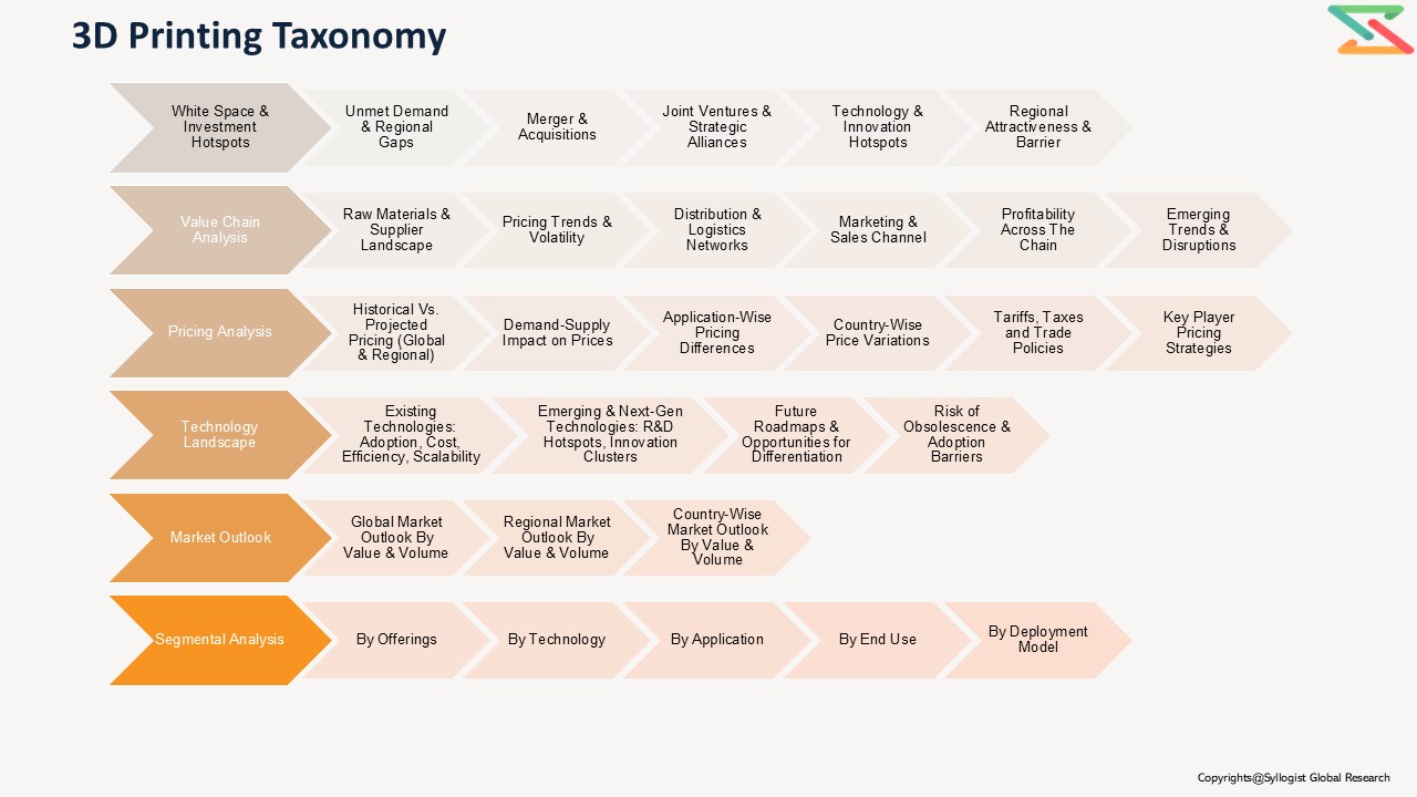 • 3D Printing Value Chain Overview (Design → Material Supply → Printing → Post-Processing → End-Use Integration)