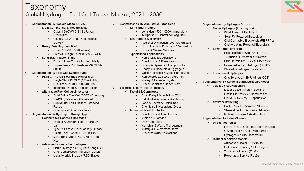 - What are the critical market metrics and forward-looking projections for the Global Hydrogen Fuel Cell Trucks Market, including total revenue, unit volume (number of trucks sold), installed fuel cell system capacity (MW), average selling price by vehicle class, and total cost of ownership benchmarking, segmented across Vehicle Class & GVW (Class 4–6 medium duty, Class 7–8 heavy duty, Class 8 long-haul tractor), Fuel Cell System Type (PEMFC single stack, dual stack, integrated PEMFC + buffer battery, H2-ICE), Hydrogen Storage Configuration (Type III 350 bar, Type IV 700 bar single and multi-tank, liquid H₂), Application / Use Case (long-haul freight, regional distribution, urban delivery, port drayage, construction, refrigerated logistics), End Use Industry, Hydrogen Source (green, blue, turquoise, grey), Refuelling Model, and Sales Channel?