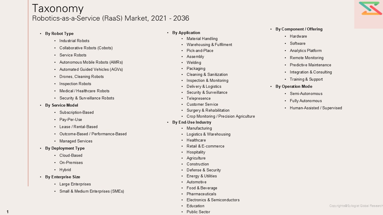 - Which industrial segments (e.g., logistics, healthcare, or agriculture) are poised for the highest RaaS adoption rates? Identifying these high-velocity sectors allows providers to tailor their hardware and software stacks to meet specific operational demands.