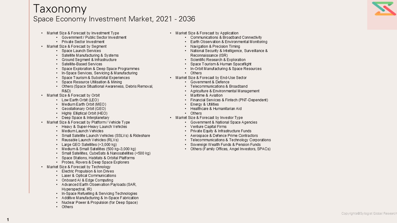 The Global Space Economy Investment Market encompasses the full spectrum of capital formation, capital allocation, and financial intermediation activities directed toward the development, commercialization, and operation of space-based assets, space-enabling technologies, space-derived data services, and terrestrial infrastructure whose function depends upon or substantially benefits from access to the space environment, including the equity investment, debt financing, government procurement, public-private partnership funding, and multilateral institutional capital flows that collectively define the financial architecture sustaining the growth and diversification of the global space economy across government-sponsored exploration programs, national security space systems, commercial satellite communications, Earth observation, navigation, space transportation, in-space manufacturing, satellite servicing, lunar economy development, and emerging deep space resource utilization ventures. The investment scope of this market encompasses venture capital and growth equity funding deployed into early and growth-stage space technology companies developing launch vehicles, smallsat platforms, propulsion systems, satellite communication payloads, Earth observation analytics platforms, space situational awareness services, and novel in-space infrastructure concepts, private equity and strategic corporate investment by aerospace primes, telecommunications companies, defense contractors, and industrial conglomerates acquiring or partnering with space technology innovators to accelerate capability development and market position establishment, sovereign wealth fund and institutional asset manager allocations to listed and unlisted space economy companies as the investable space sector universe expands through initial public offerings, special purpose acquisition company transactions, and the maturation of established commercial space enterprises toward profitability and dividend-generating stability, government space agency program budgets and national space office procurement expenditures funding launch services, satellite development, crewed spaceflight, scientific exploration, and space situational awareness systems across the major spacefaring nations of the United States, China, Russia, Europe, India, Japan, and a growing cohort of emerging space nations, national defense ministry investment in military satellite communications, intelligence surveillance and reconnaissance constellations, missile warning systems, space domain awareness networks, and resilient positioning navigation and timing infrastructure whose strategic importance to national security is driving sustained and in many nations accelerating capital commitment, multilateral development bank and international financial institution co-investment in space-enabled development applications including satellite-based agricultural monitoring, disaster response, climate observation, and telecommunications infrastructure serving underserved populations in developing economies, and the project finance and infrastructure fund capital being directed toward the ground station networks, satellite manufacturing facilities, launch range infrastructure, and spectrum and orbital resource management systems that constitute the essential enabling physical infrastructure of the commercial space economy. The technology and application landscape within this investment market spans the complete range of space economy verticals including broadband and narrowband satellite communications serving consumer, enterprise, maritime, aviation, and government connectivity markets, very high resolution and hyperspectral Earth observation systems providing geospatial intelligence, environmental monitoring, agricultural analytics, urban planning, and infrastructure inspection services, global navigation satellite system augmentation and alternative positioning navigation and timing services, space launch services spanning reusable orbital launch vehicles, dedicated smallsat launchers, rideshare mission services, and emerging super-heavy lift systems, in-orbit services including satellite refueling, life extension, debris removal, inspection and repair, and orbital manufacturing of materials and structures enabled by microgravity and vacuum environment conditions, lunar surface access and cislunar transportation infrastructure supporting both scientific exploration and the early commercial development of lunar resources, space tourism and commercial human spaceflight experiences spanning suborbital and orbital flight services, and the ground-based data analytics, artificial intelligence processing, and enterprise software platforms that convert raw space-derived data into the actionable intelligence products delivering commercial and governmental value to end-user markets across agriculture, maritime, energy, insurance, financial services, defense, and humanitarian response sectors. The value chain of this investment market extends from foundational research institutions and university space engineering programs generating the scientific and technical knowledge base, through deep technology venture investors providing pre-commercial capital to early-stage space technology developers, established aerospace system integrators and satellite manufacturers translating technology into commercial products, launch service providers delivering the transportation infrastructure connecting Earth-surface assets to orbital operating environments, satellite ground system operators managing the command, control, and data downlink infrastructure of space-based assets, downstream data analytics and application service companies delivering commercially monetizable space-derived intelligence to enterprise and government end users, and the capital markets infrastructure of investment banks, space-focused funds, stock exchanges, and rating agencies whose financial intermediation functions 