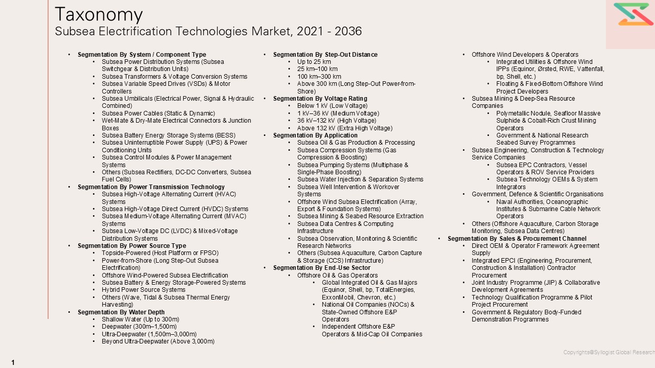 - Tier-1 Global Integrated Subsea Technology & Energy OEMs with Subsea Electrification Portfolios (Baker Hughes, Siemens Energy, ABB, TechnipFMC, Schlumberger / SLB, Subsea 7, etc.)